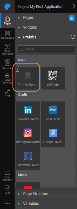 Once the published Prefab is imported it will be available in the Widget Toolbox for drag and drop usage. You can use the refresh icon to check for any modification/updates in the Prefab.