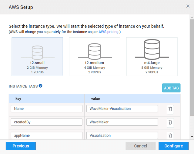 - Select the appropriate instance size based upon the resources and database utilized by your app and enter the key-value instance tags (see here for best practices for instance tagging)