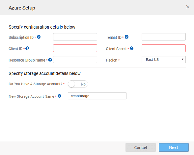 • You must set up an Active Directory application and assign the required permissions to it. The permissions include access to Microsoft.compute, Microsoft.network and Microsoft.storage. See here to create AD app.
