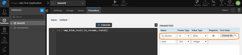 • When param type of Blob is IN in a procedure, then the generated API for such procedure will be accepted as multipart data and the remaining fields are expected as one part with the content type application/json. There can be multiple Blob inputs parameters.