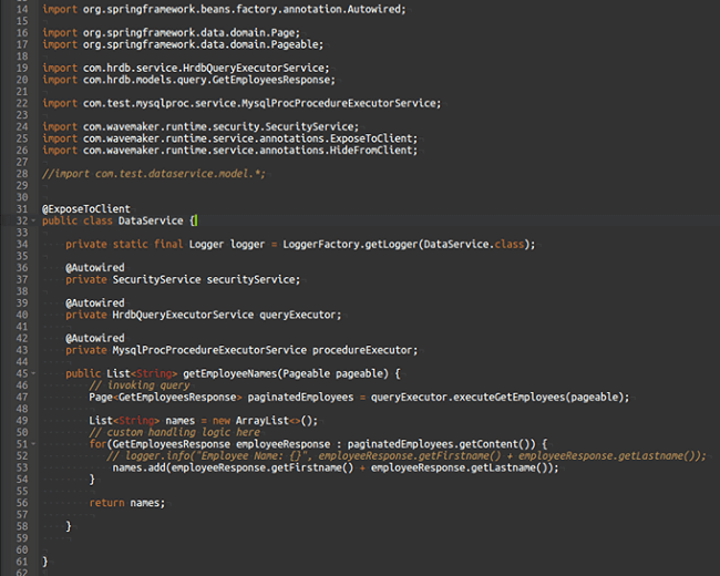 As mentioned in previous documents, there will be a service method generated for each query and procedure. See here for query service methods and procedure service methods. We can use these methods to invoke those in java services.