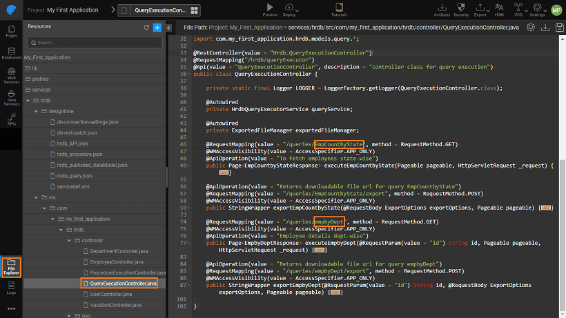 For each and every named query, there will be a rest service generated from query execution controller and exposed under APIDesigner panel. Here we are seeing two queries - EmpCountByState and which were created from the query editor.