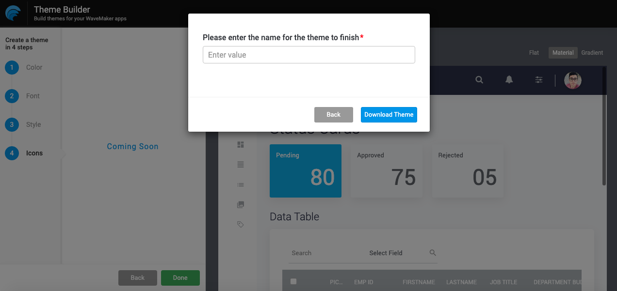Theme Builder is a WaveMaker application that allows you to build a theme by changing colors, typography, and styles of the components and elements without needing to edit the code.