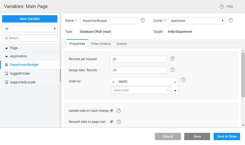 We can also specify the filterFields and orderBy options while invoking the variable. In the below example, the variable will get all the records satisfying the condition deptId==1 & empId>1, and also with the specified sort order. Please refer the Filter Conditions doc for the list of available matchModes.