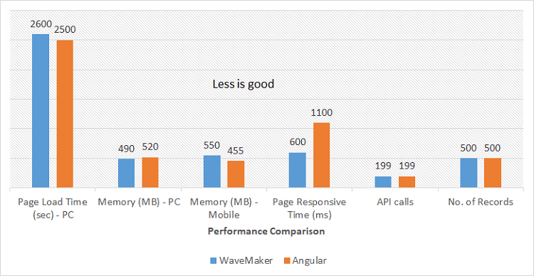 Metrics such as page load time, memory consumed on the client side, page interaction response times and the number of backend service calls are plotted. As indicated in the figure above, the delta is very minimal and the application built with WaveMaker performs at par on all counts in comparison to the app built traditionally.