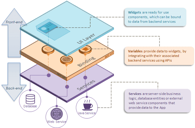Service layer represents backend services auto-generated from databases, external web services or custom Java services, and more.