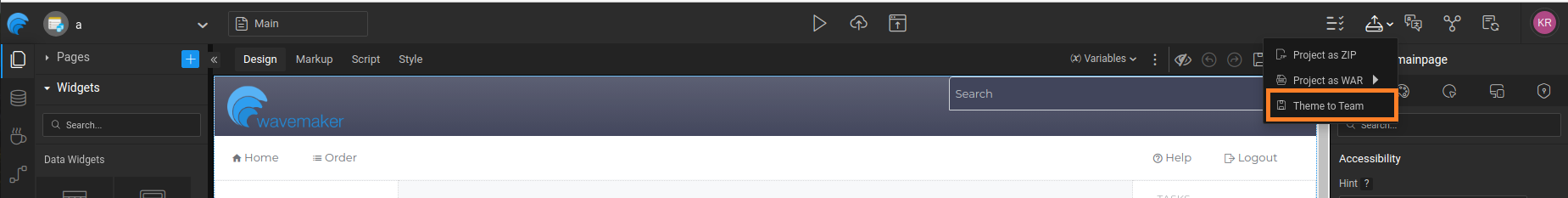 - Team Version: Themes can be published using the Export > Theme to Team option: