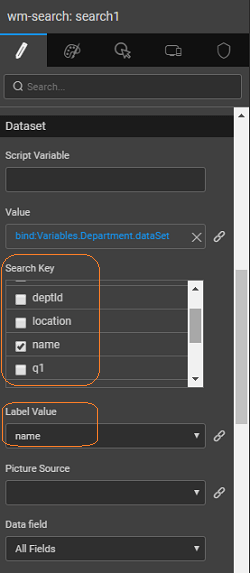 4. Set the Search key and Label Value properties to the column name you want to search by, in this case, name. Note: The Search Key, Label Value, and Image Source are bindable. For example, the Label Value can be bound in this case to 'deptcode+name', using the expression option from the binding dialog.