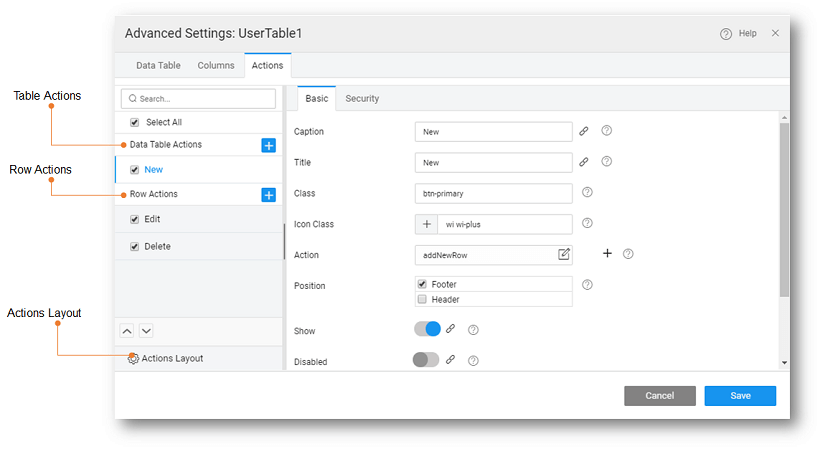 Data Table actions include actions at the table-level and the row-level. These options are available from the Actions tab of the Advanced Settings property of the Data Table.