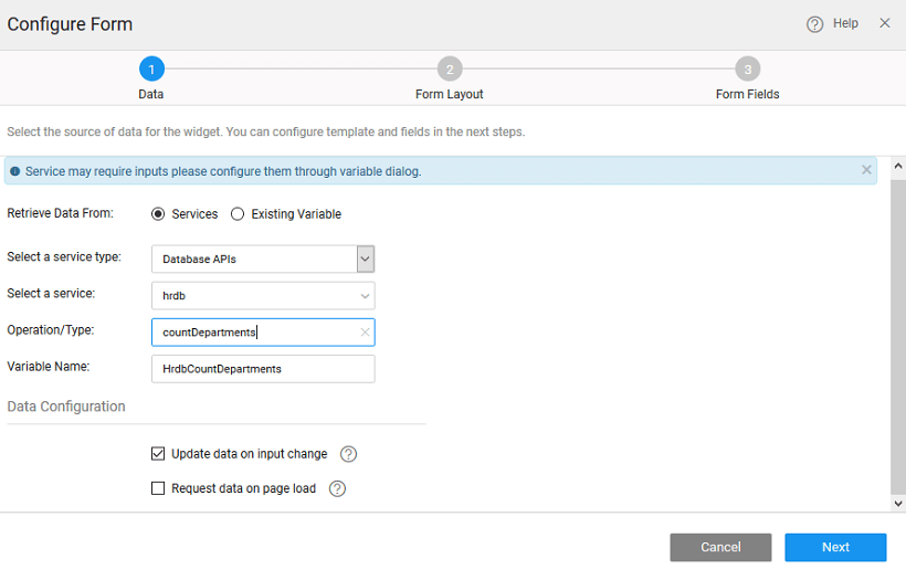 There can be different scenarios to deal with when configuring your Form Widget with a data source. The data source can be in the form of a variable based on the APIs exposed by the imported web, java or query service.