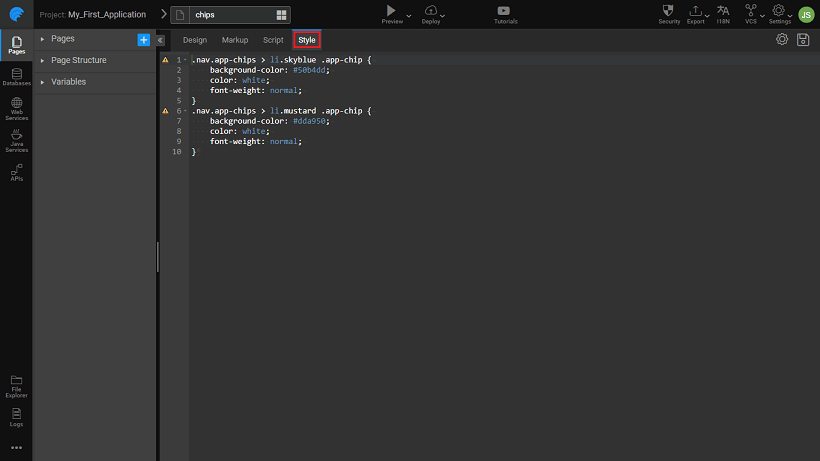 - Chip item class name property from the styles tab can be used to apply styles for individual items of the Chip: