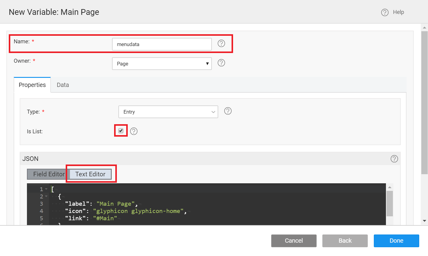 3. Name the variable as menudata and s_elect _isList option.
