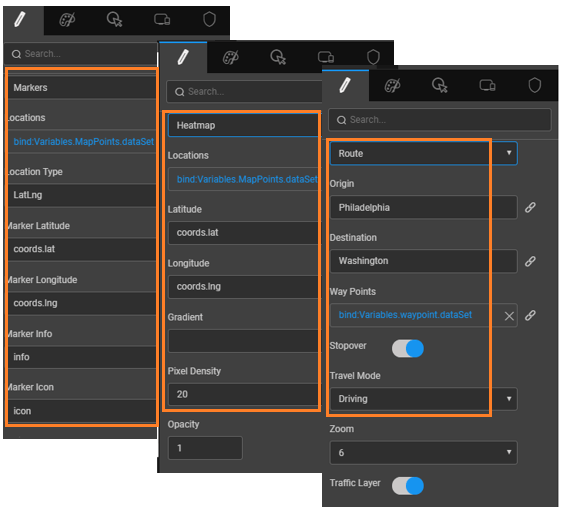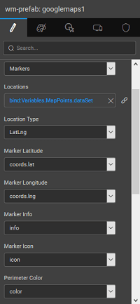 1. Markers help to mark a given location with an icon, information, highlight using a circle of given radius and shade(color). The input can be any variable which has the above-mentioned fields delimited. The variable can be bound to the Locations property and each of the above properties can be set to the elements of the variable.