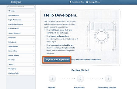 2. To open the Instagram API platform click here.