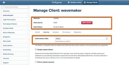 1. Click Manage Clients to acquire the Client ID and Client Secret for the created App Client. Paste the callback URL from step 3 in the redirect URI section of the App in Instagram.