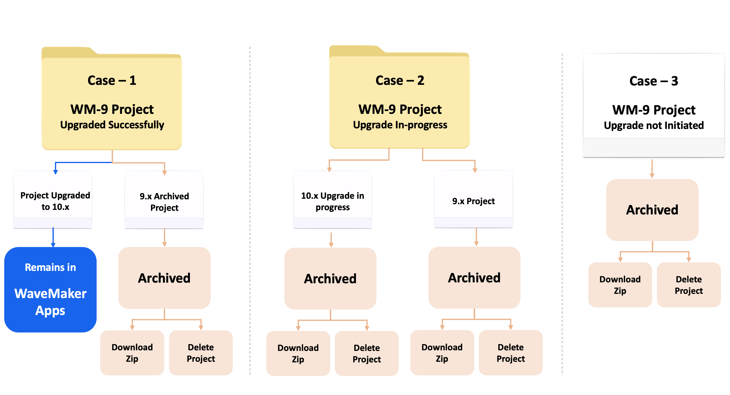 Case-1: When you finish the upgrade process, the WM 9 project gets archived in that folder. In this case, the upgraded project, WM 10, remains in WaveMaker apps and has all functionality that a regular WaveMaker app has. The WM 9 version of the project moves to the archived location, which should be safe to delete.