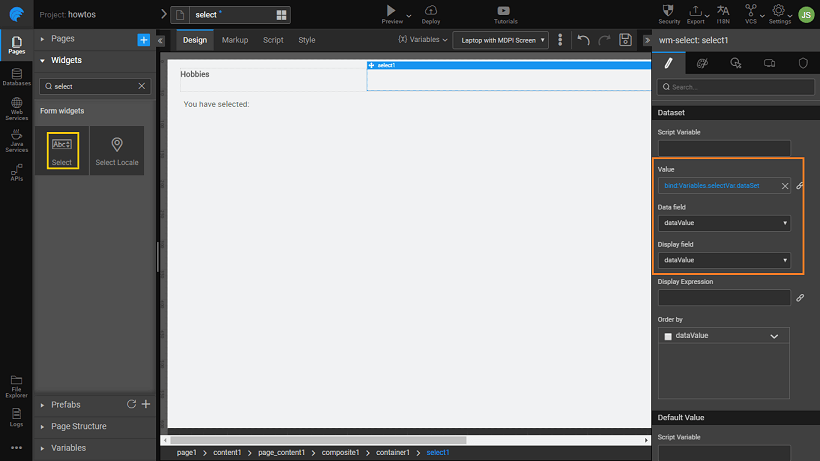 3. Bind the Select Widget to the Model Variable dataset