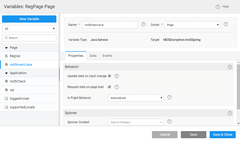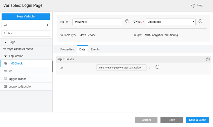 • Add the following to the Java Service code. Here we are using an MD5 hashing algorithm to generate a checksum for the password field, refer here for more details. Ensure that the length of the password column in the database is greater than the length of the result from the encryption algorithm used, in this case, it should be greater than 32.