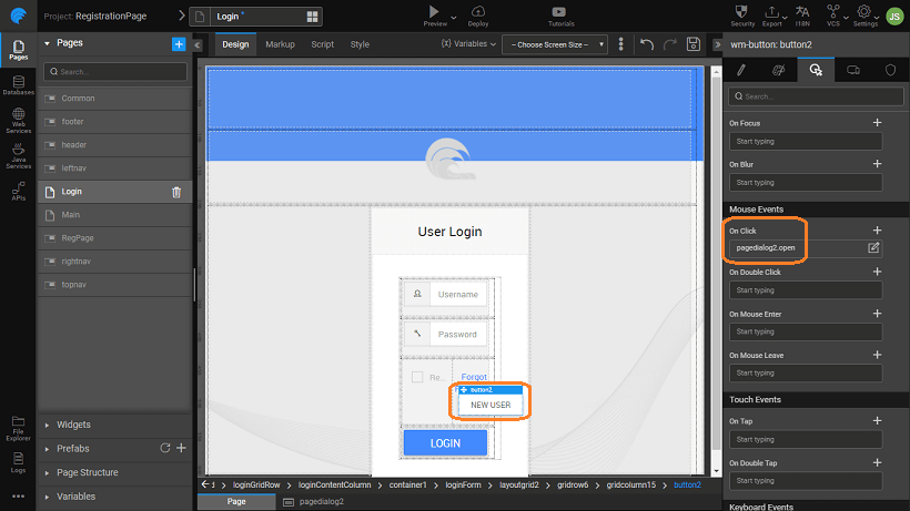 • Set the onClick event of the Sign In to loginAction. This will ensure that when any user logs in, the password is encrypted before checking it against the database by the login variable.