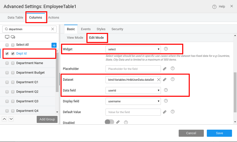 - Drag and drop Data Table (editable) using a table, say, Employee, as the data source.