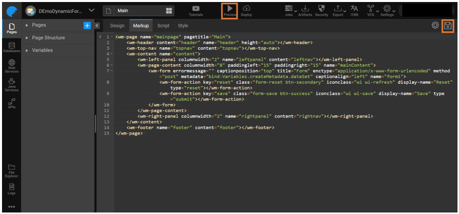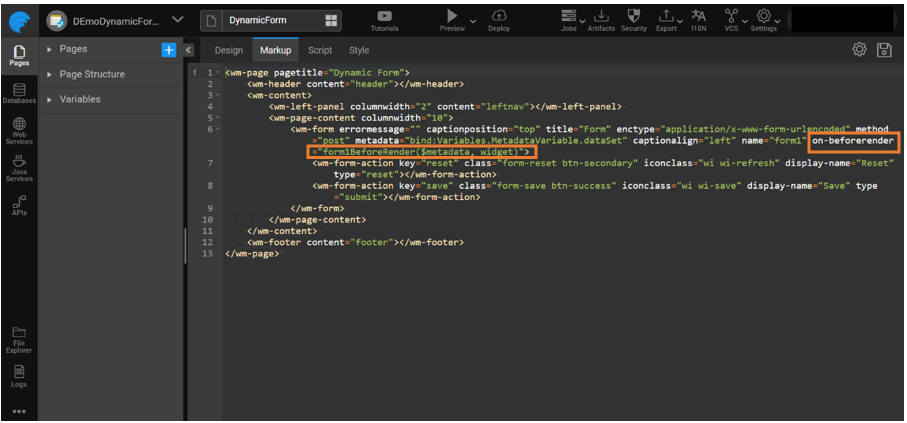 - Go to the Markup tab and add metadata property in the markup with the created variable to bind the variable holding metadata with the Form.