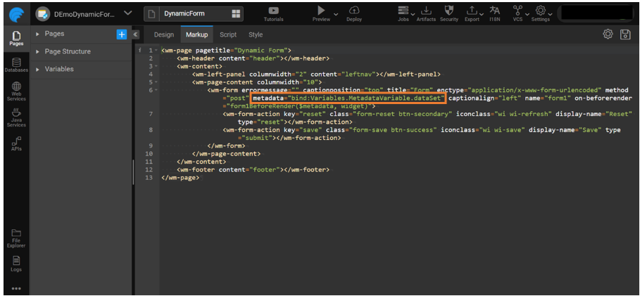 - Go to the Markup tab and add metadata property in the markup with the created variable to bind the variable holding metadata with the Form.