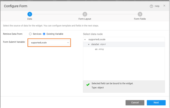 - Drag and drop the Form widget with an existing variable as "supportedLocale" and uncheck the Fields as you are creating a Dynamic Form.