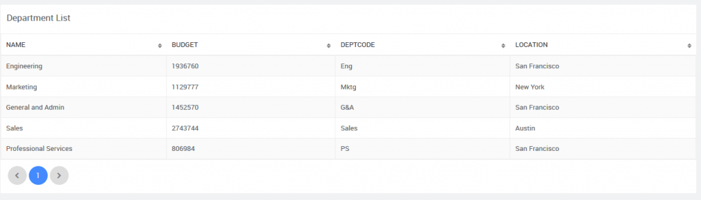 - Department page listing the departments in a Data Table,