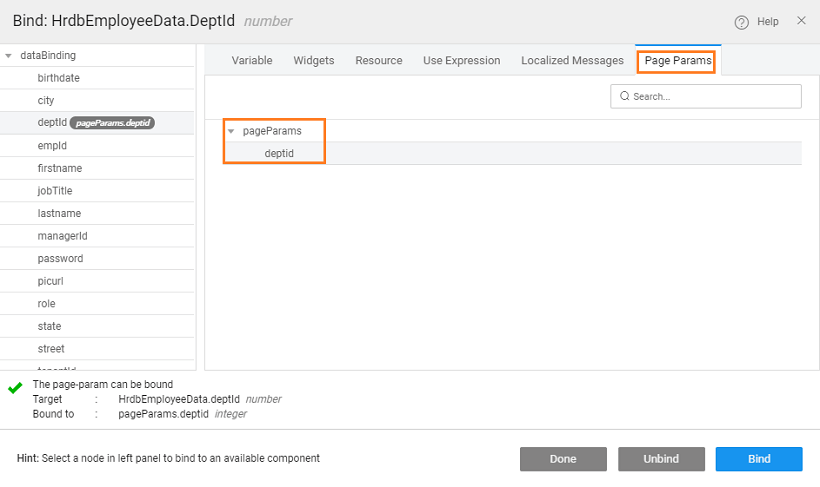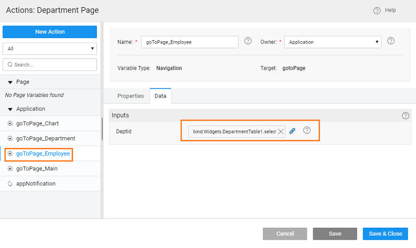 - Pass Parameter: Now we need to pass the selected row deptid to the Employee page. Select the goToPage_Employee from the Actions dialog and select the Data tab. Click the bind icon next to the deptid