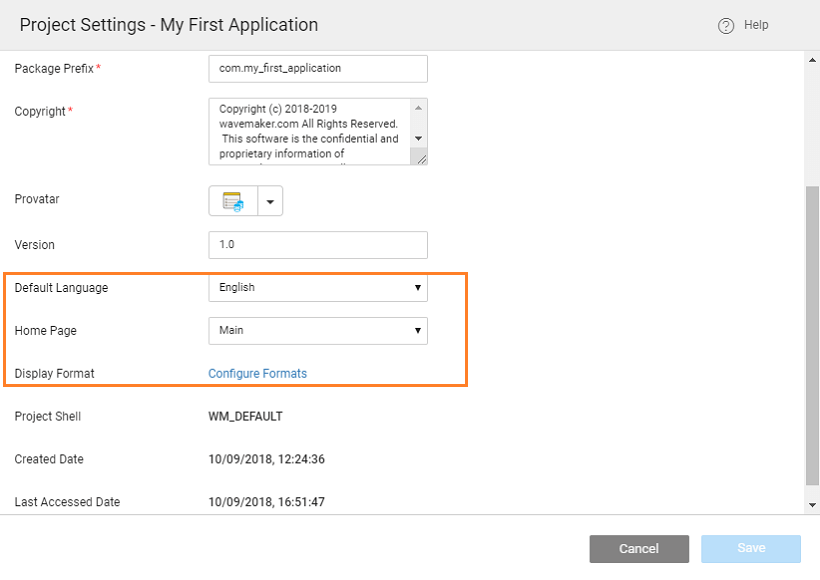You can set the Home Page, Default Language and Display Format for date and time fields in the app from the Project Settings dialog. Project Settings can be accessed from project configurations of the Project Workspace.