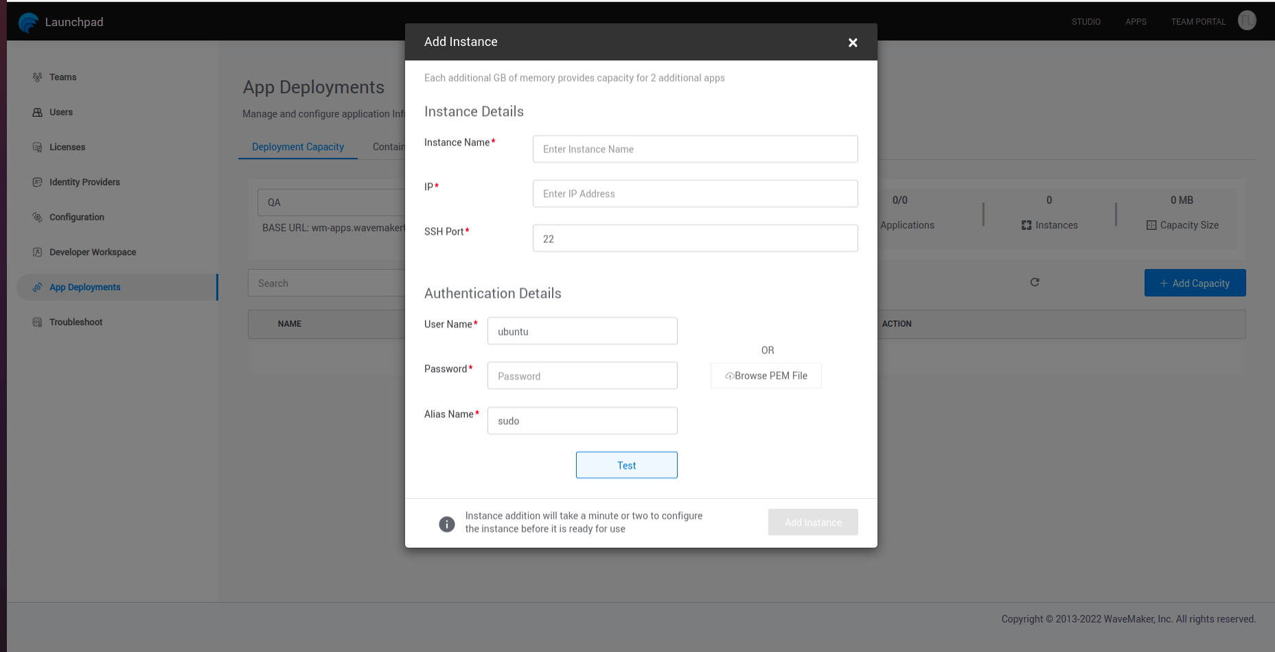 • During workspace instances configuration process WaveMaker running commands with sudo , if user using any another name or command for sudo, user need to add that as alias in ~/.bash_aliases file and also need to provide that alias name during studio workspace/app deploy capacity adding at launchpad.