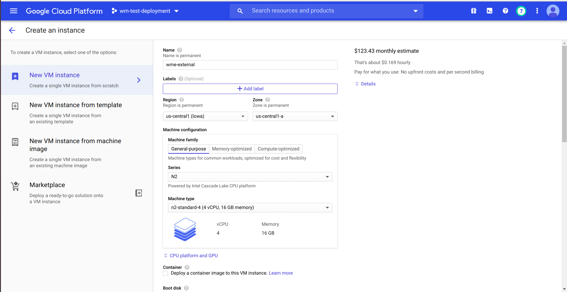 • Select region,zone and provide name for Instance.select machine type with minimum 16 GB memory.