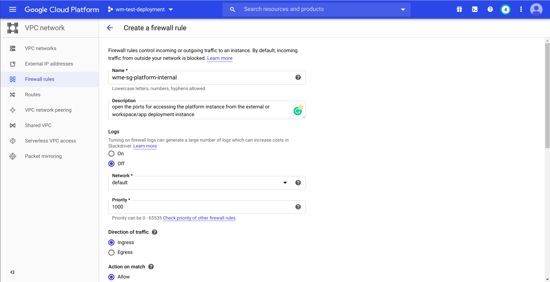 • At network section provide respected network tags of your firewall if you using source and target tags at firewall rules and create Instance.
