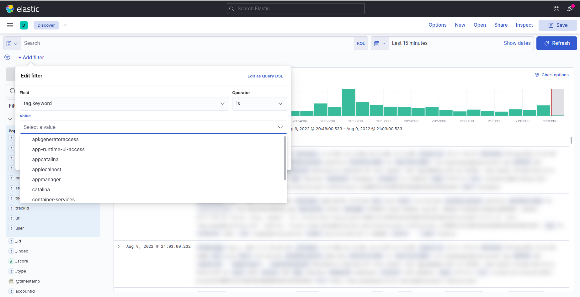 • Select Discover from the Kibana and add the Filter by selecting tag.keyword. A drop down with the list of microservices will display. Select the microservice ex:lbaccess log and save to apply the filter.
