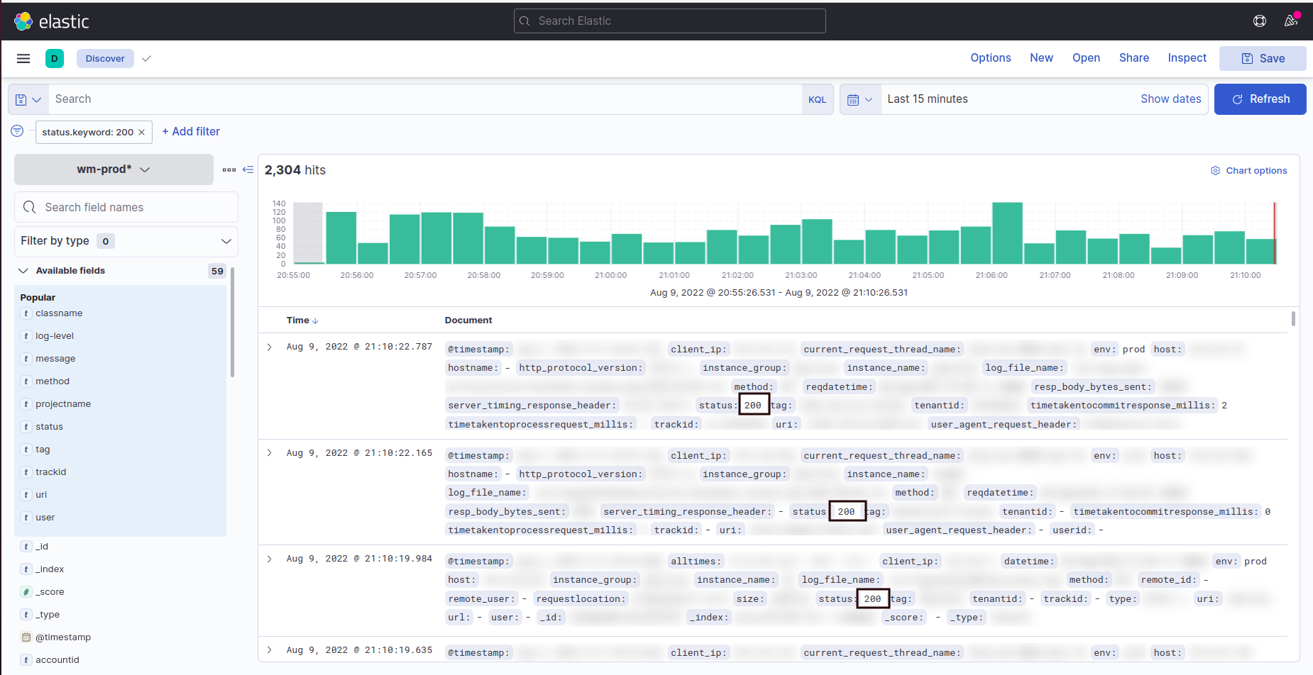 • Select Discover from the Kibana and apply the Filter by selecting status.keyword. A drop down with the list of status codes will display. Select the status code and save to apply the filter. The below screenshot displays the searched filter results of status code 200.