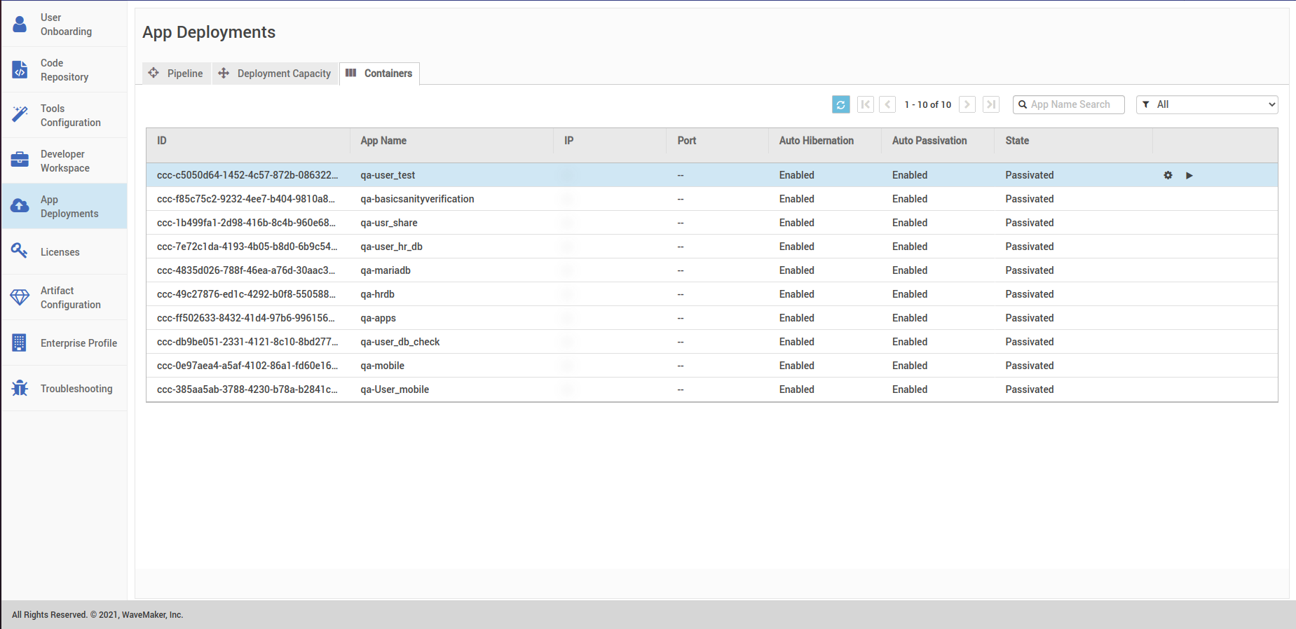 • Alternatively, you can passivate all the hibernated containers in one click. To do this, follow the steps provided below.