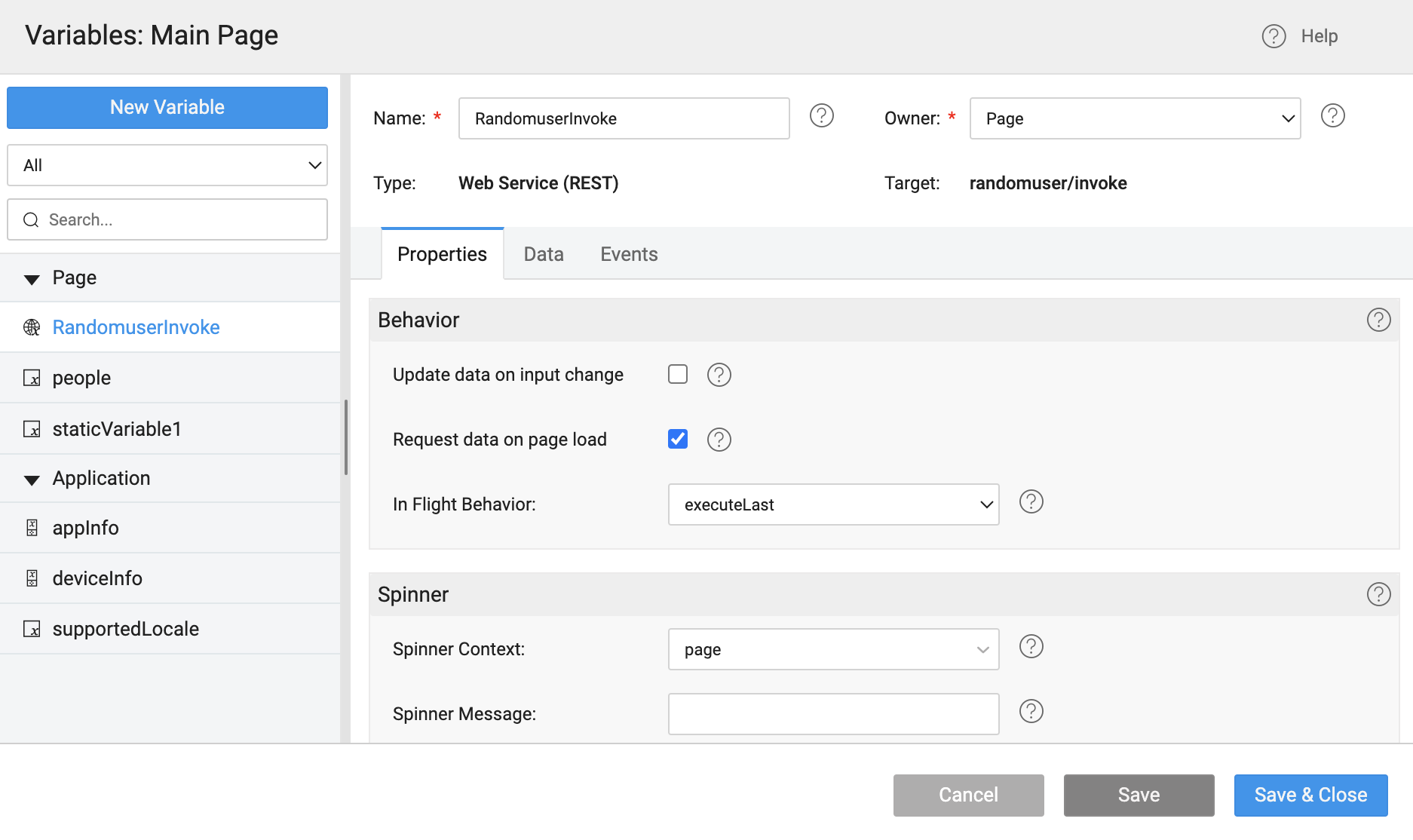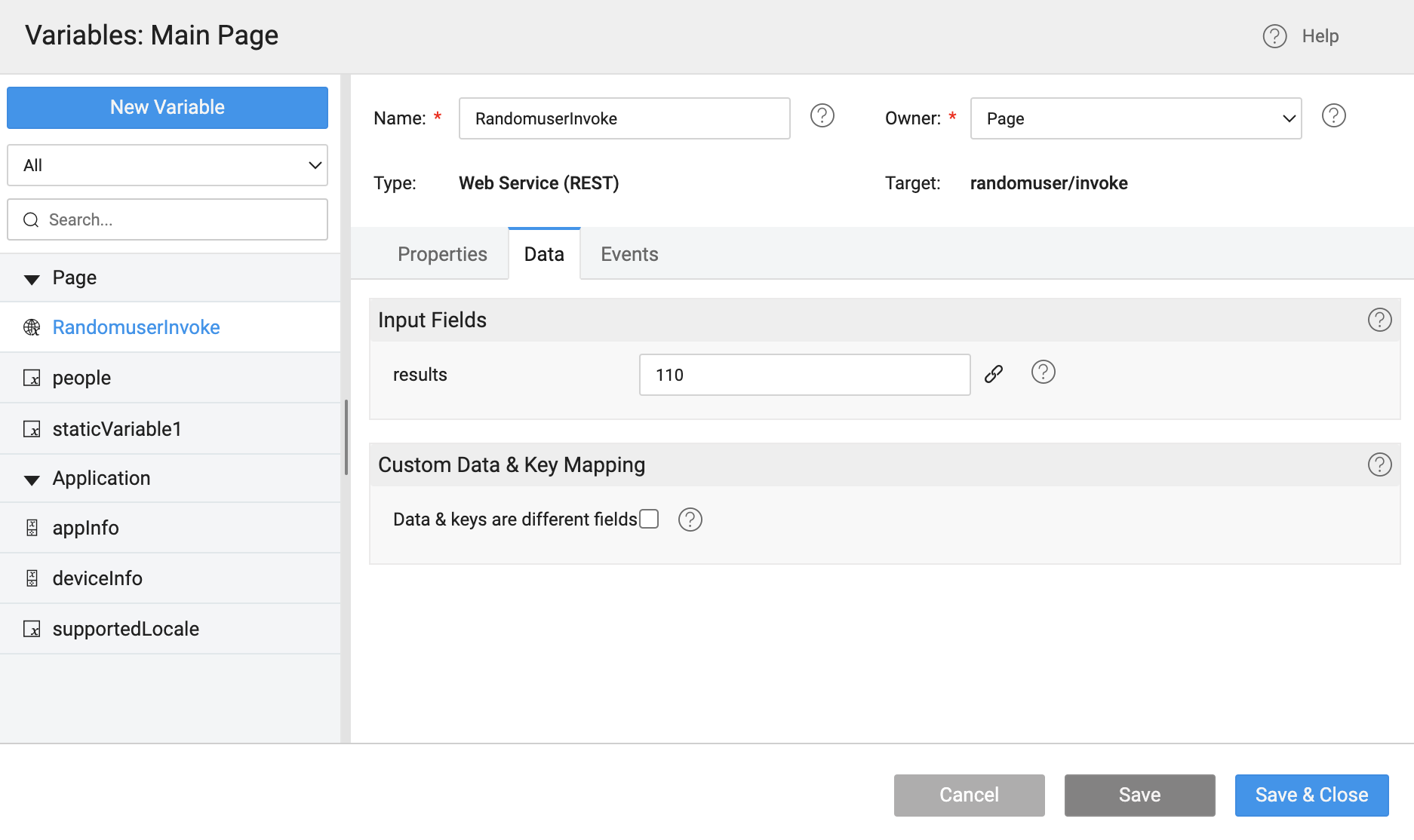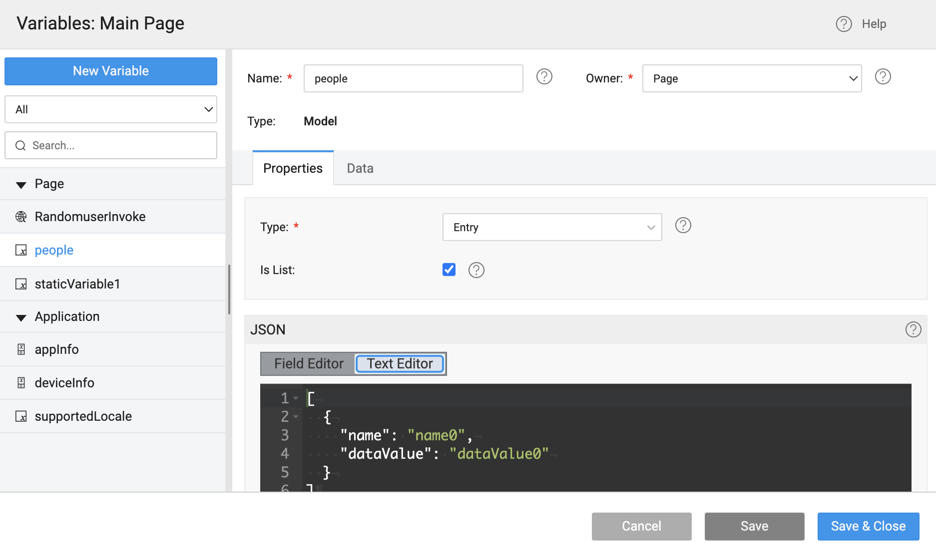 Created a Model Variable people in Main page with Type as Entry and a Web Service Variable RandomuserInvoke for above web service randomuser