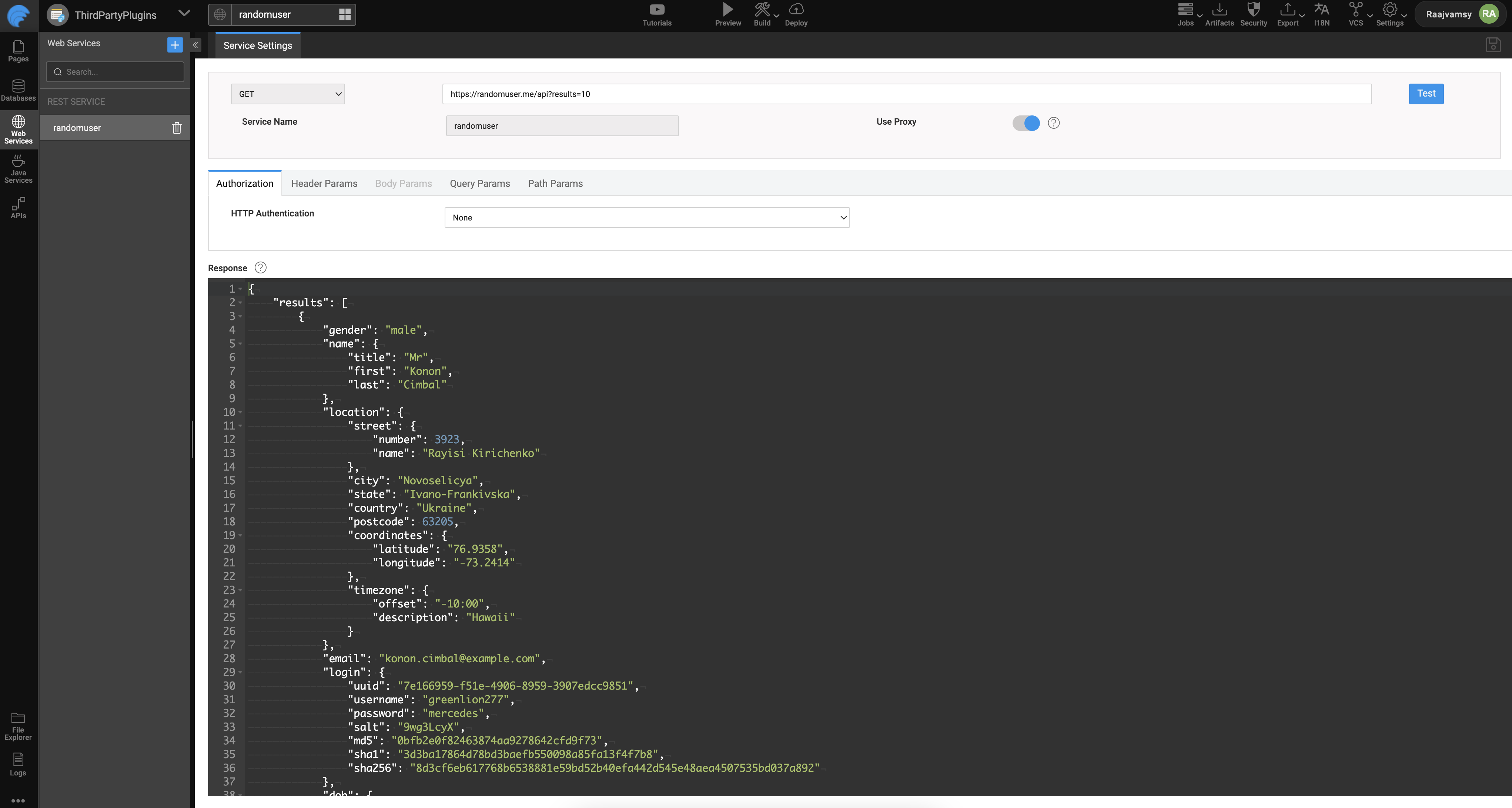 Created a Web service with name randomuser with sample api https://randomuser.me/api?results=10