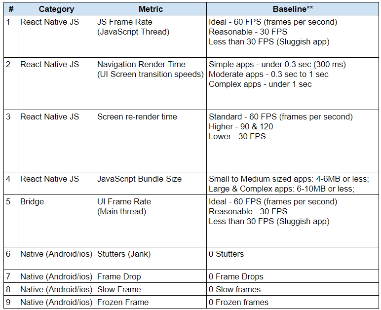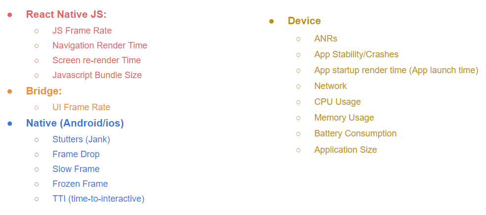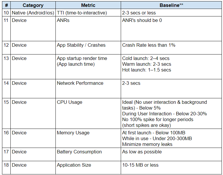 We have identified categorized few important metrics that are essential for measuring the performance of a mobile application. The following are the categories of performance metrics: