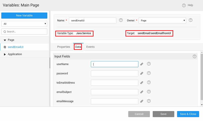 - The input parameters can be accessed from the Data tab and can be bound or set to static values