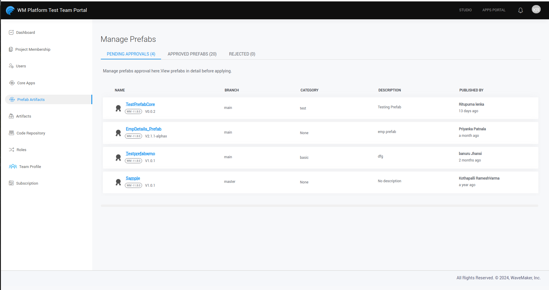 Prefab is developed from the Project Workspace, similar to any other app development, and then made available to other developers. Publishing states for a Prefab include: