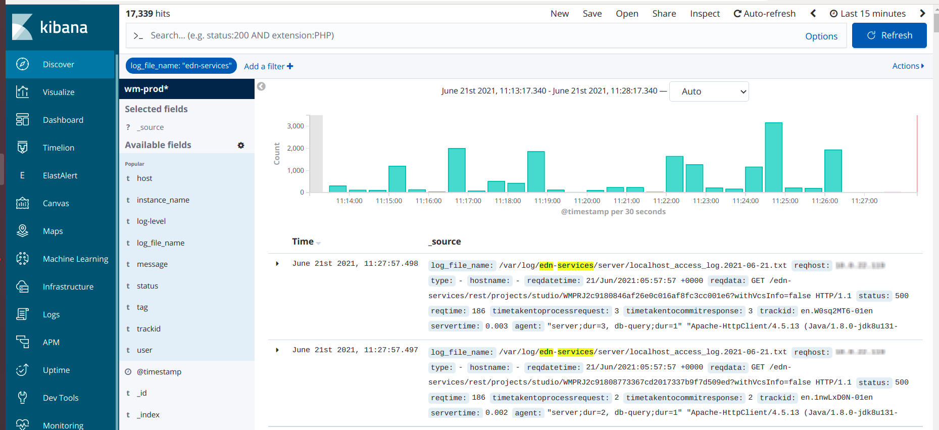 - Select Discover from the Kibana and add the Filter by selecting log_file_name as edn-services.